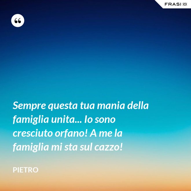 Sempre questa tua mania della famiglia unita... Io sono cresciuto orfano! A me la famiglia mi sta sul cazzo!